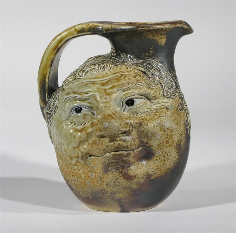 A Martin Brothers stoneware face jug each side modelled with a smiling face, glazed in shades of grey, ochre and brown incised BX 37 R W Martin London & Southall, 16 cm. high