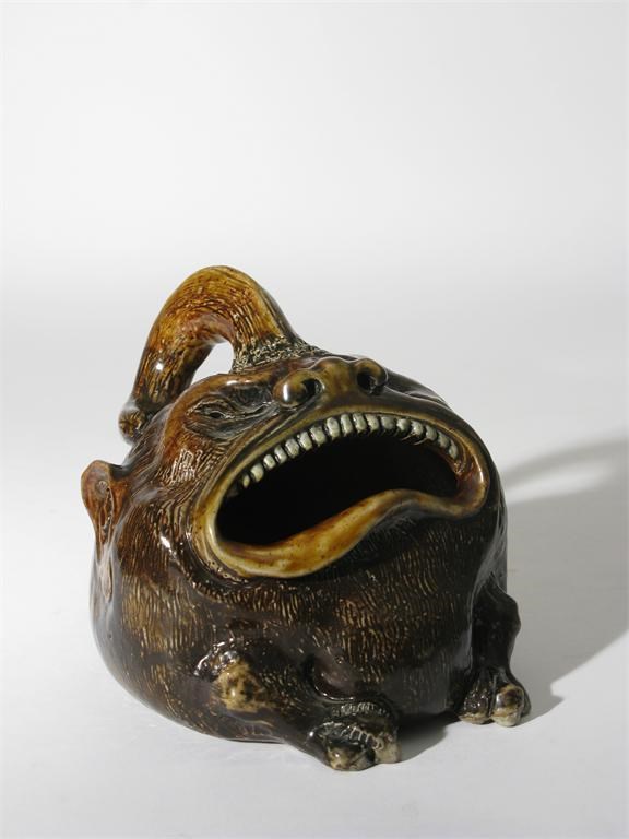 A good Martin Brothers stoneware spoon warmer by Robert Wallace Martin, modelled as a rodent creature with angry toothy grimace, glazed in shades of brown incised R W Martin & Bros, London & Southall, 14 cm. high.