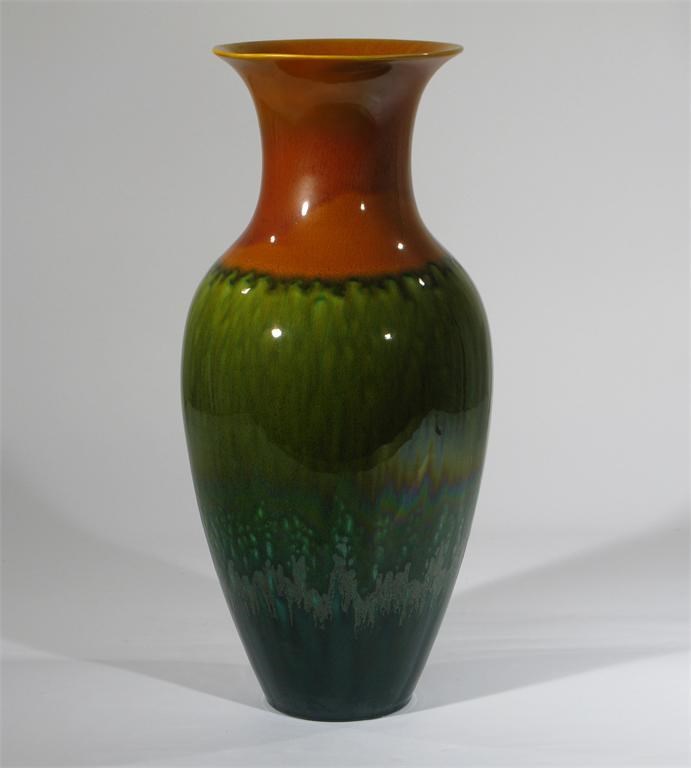 A tall Linthorpe Pottery vase model no.889, shouldered form with flaring rim, ochre shoulder with olive green body impressed marks, restored top rim 44.5 cm. high