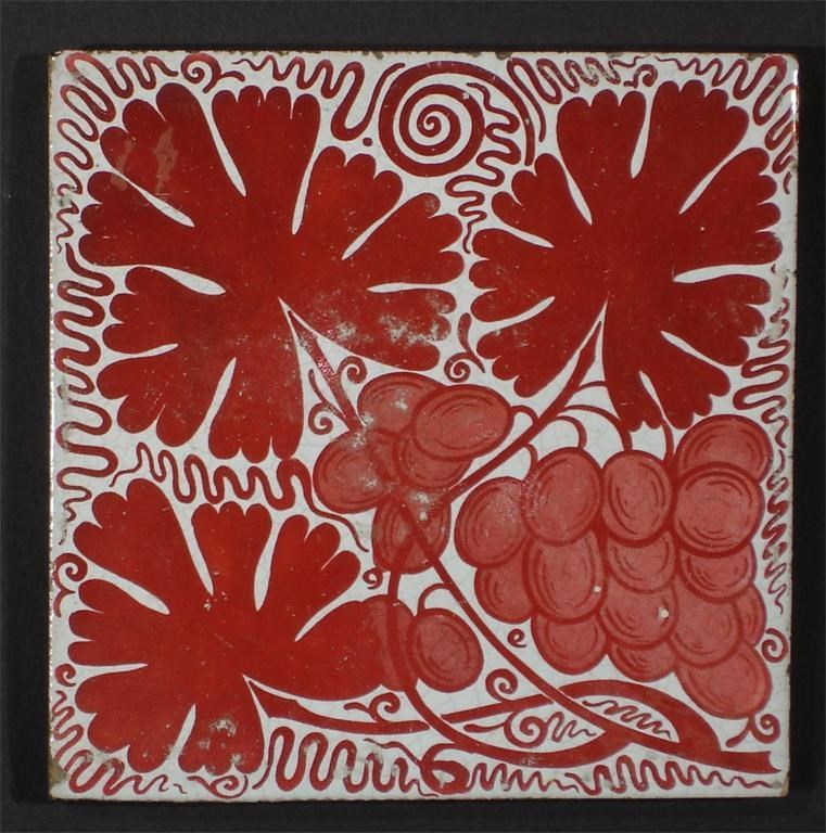 A William De Morgan tile painted with fruiting grape vine, in ruby lustre on a white ground impressed Sands End roundel, minor chips and wear to lustre 16cm. square