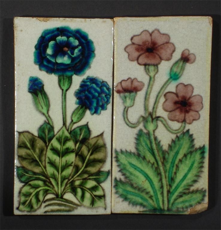 A pair of William De Morgan tiles one decorated with a rose the other a primula, in aubergine, blue and green on a white ground impressed marks, minor rim chips 15.5 x 7.5cm. high