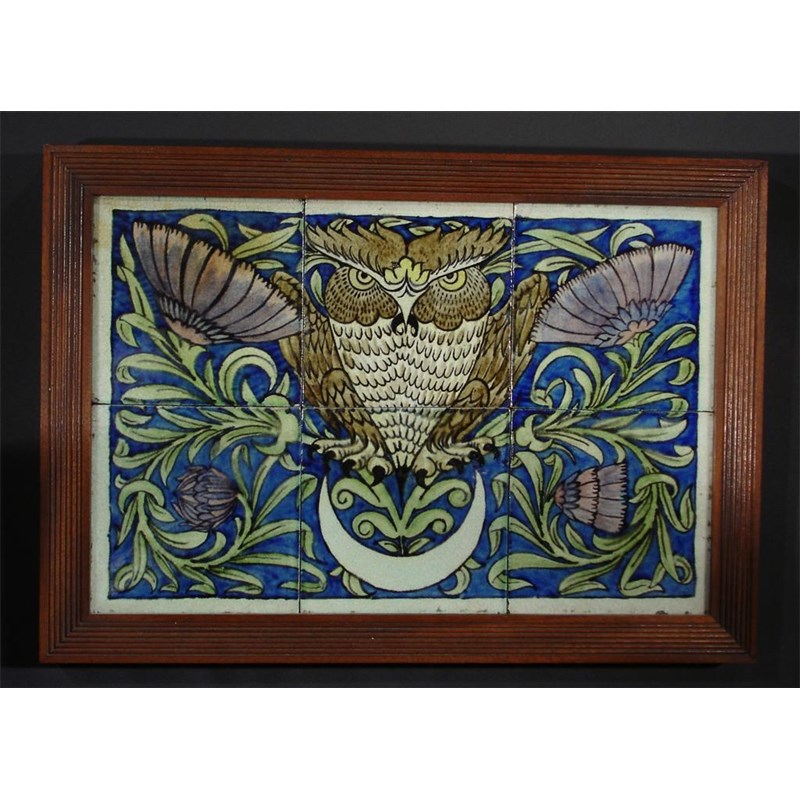 A William De Morgan six tile panel painted with an owl above crescent moon, amidst carnation flowers in colours on a blue ground, framed impressed Merton Abbey mark 46 x 30.5cm. Literature Martin Greenwood The Designs of William De Morgan Richard Dennis Publications, page 179 plate 413 for an original design Jon Catleugh William De Morgan Trefoil page 137 plate XVII for a similar panel Provenance William De Morgan, Richard Dennis Gallery exhibition June 2004, catalogue number 42