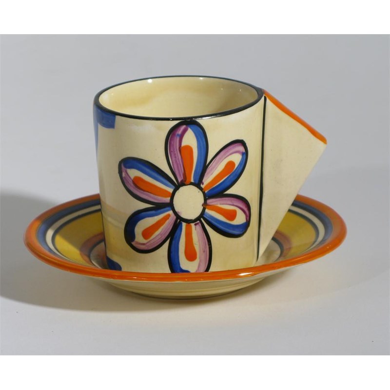 'Daisy' a Clarice Cliff Bizarre Conical coffee can and saucer painted in colours printed factory mark 7 cm. high