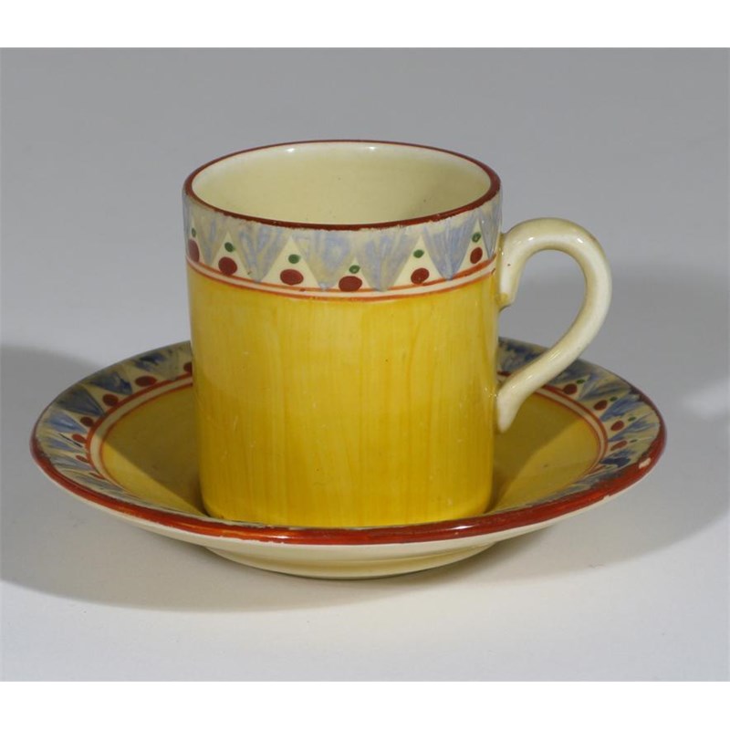 'Original Bizarre' a Clarice Cliff Tankard coffee can and saucer painted with a simple band of blue triangles and red dots, above a yellow band printed mark, red Bizarre mark 7 cm. high