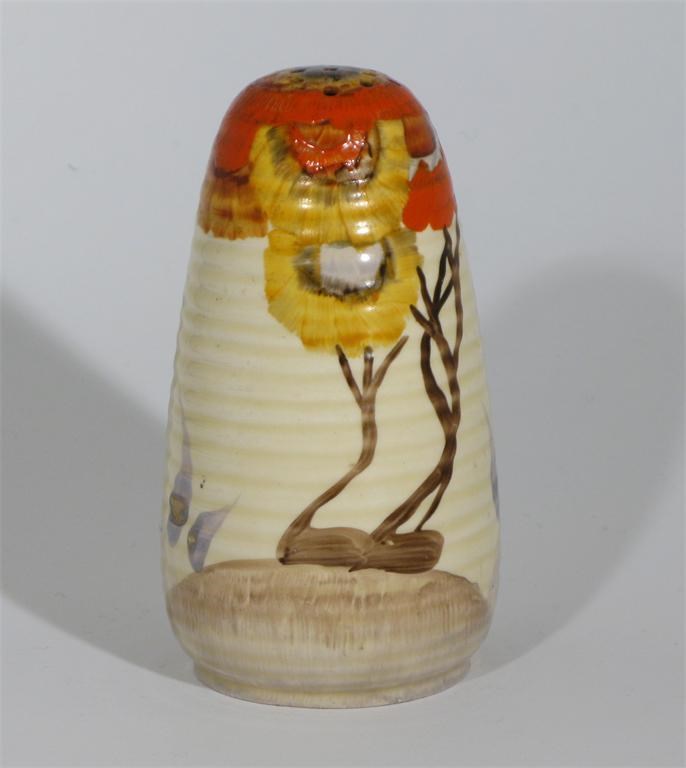 'Rhodanthe' a Clarice Cliff Bizarre Lynton sugar sifter painted in colours
