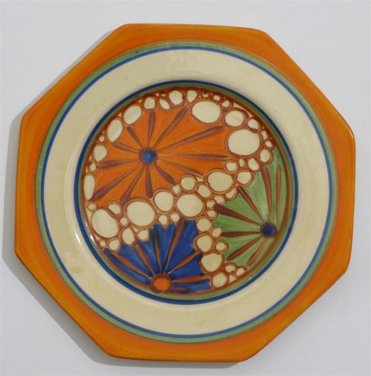 'Broth' a Clarice Cliff Fantasque Bizarre side plate painted in colours inside blue