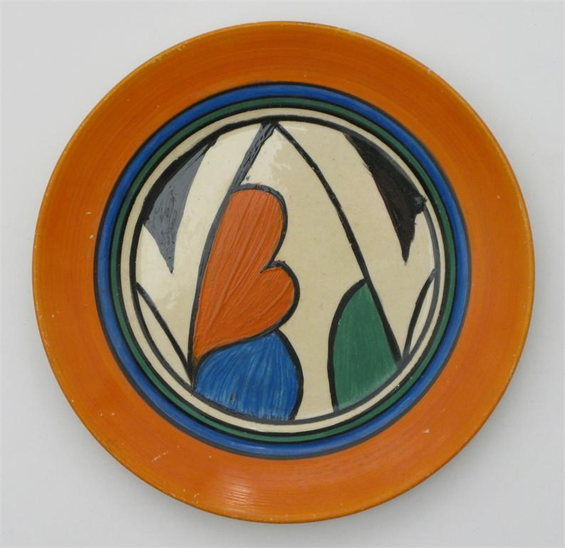 'Double V' a Clarice Cliff Bizarre side plate painted in colours inside green