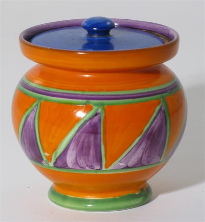 'Original Bizarre' a Clarice Cliff preserve and cover painted with orange and purple triangles, outlined in green printed factory mark 10 cm. high