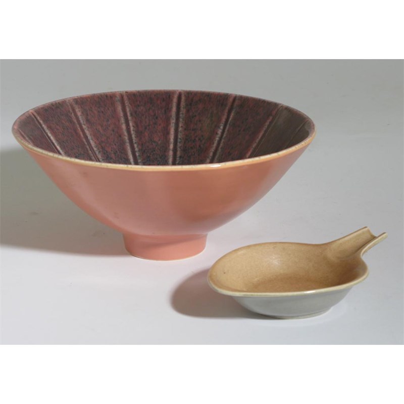 A Wedgwood earthenware bowl by Norman Wilson, on shallow foot, the interior ribbed and glazed mottled lavender, the exterior matt salmon pink, and a small leaf shaped dish impressed marks, printed mark and NW 19.5 cm. diam.