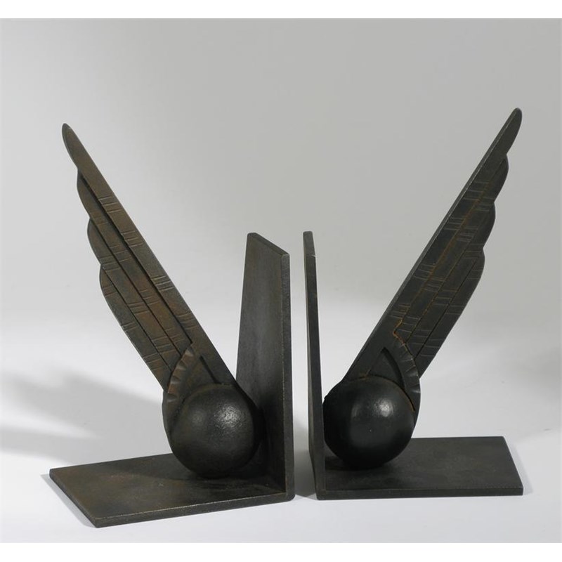 A pair of patinated iron book ends designed by Edgar Brandt, each modelled as a stylised wing unsigned 23cm. wide