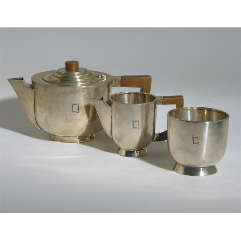 A Charles Boyton three piece silver tea set, comprising teapot and hinged cover, milk-jug and sugar basin, with bakelite handles stamped marks, London 1934, facsimile signature teapot 12cm. high