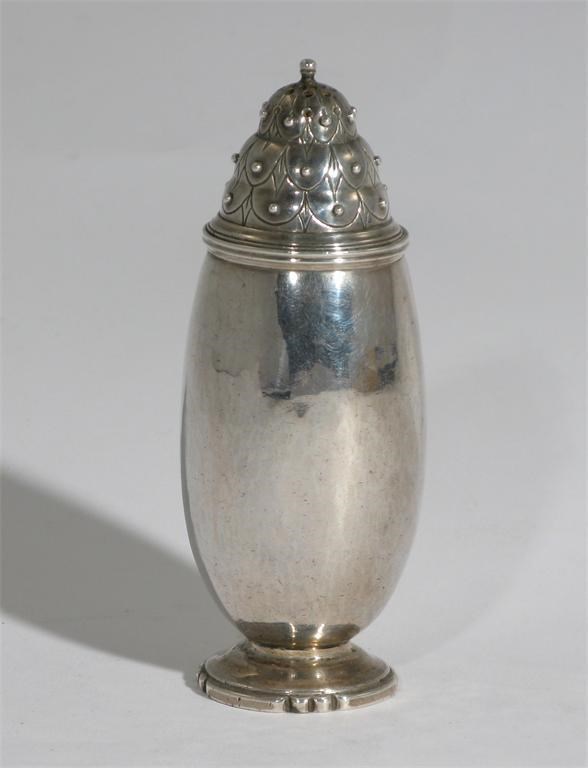 An H.G.Murphy silver pepper pot the bayonet top with foliate decoration, hammered finish stamped marks, London 1935 10.5 cm. high