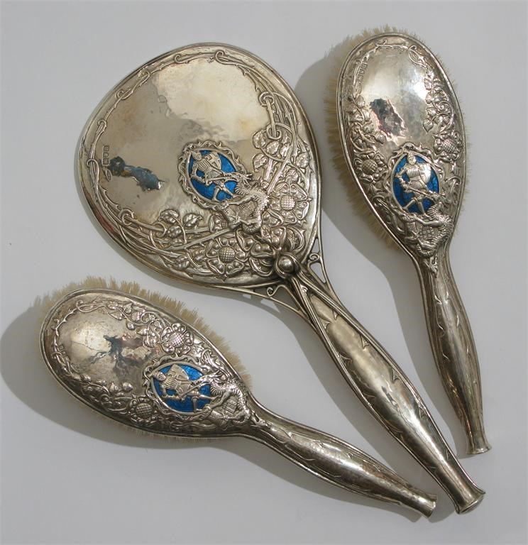 An Omar Ramsden and Alwyn Carr silver and enamel dressing table set comprising two brushes and a hand mirror, each decorated with St George killing the Dragon pierced on blue enamel ground, with dog rose border stamped marks, London 1915 Omar Ramsden et Alwyn Carr Mr Fecerunt, mirror, 35 cm. wide