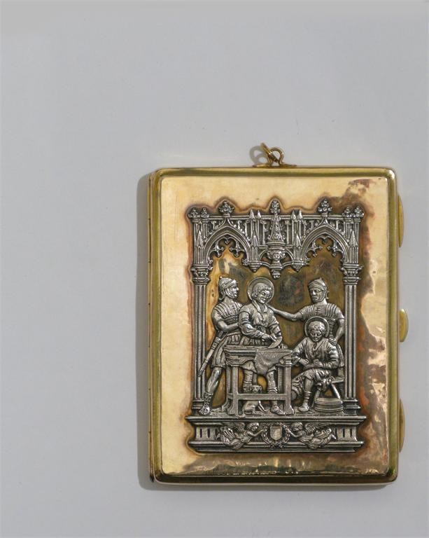 A rare Omar Ramsden gold cigarette case rectangular, model no.888, made for George William Poulton, cast in low relief with a biblical scene, the reverse inscribed 'As Proper Men as ever trod upon neats leather have gone upon my handiwork' stamped marks, London 1922 Omar Ramsden Me Fecit MCMXXII 11 cm. high