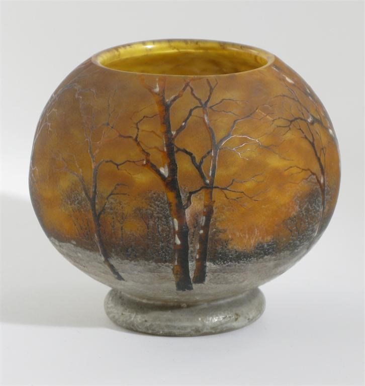 A good Daum winter landscape enamelled glass vase ovoid form on applied foot, enamelled Daum Nancy to foot 11cm. high