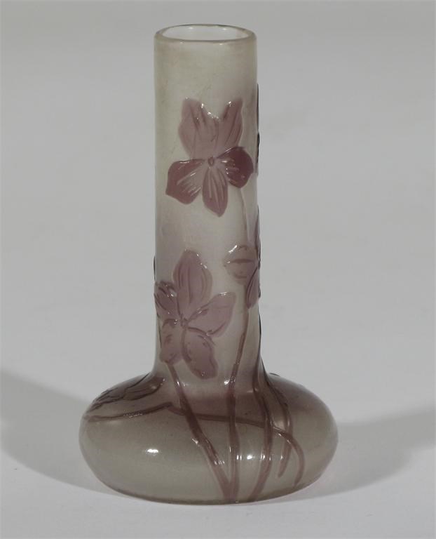 A small Art Nouveau Galle cameo glass solifleur vase opaque glass overlaid with purple violets, polished finish cameo signature Galle 10cm. high