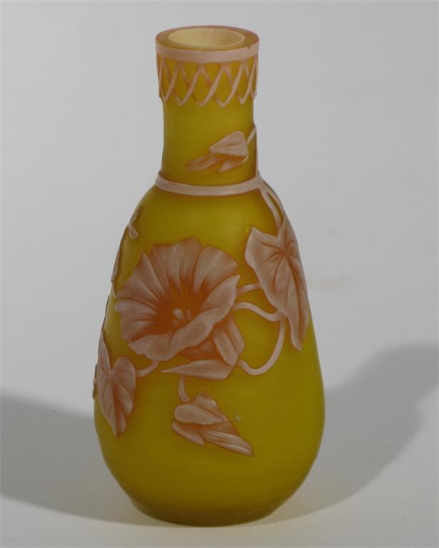 A miniature English cameo glass vase probably Webb, pale yellow glasss body overlaid with pink and white glass decorated with convolvulus sprays unsigned 8cm. high