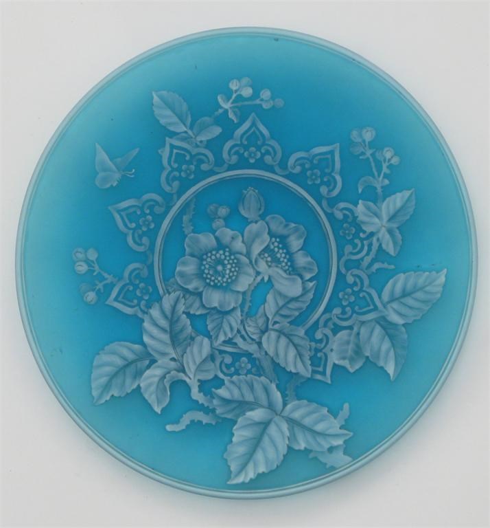 A Stourbridge cameo glass plate blue glass decorated with a butterfly above wild rose flowers...