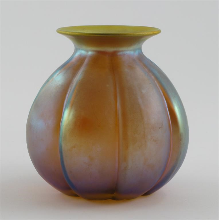 A W.M.F Myra glass vase ribbed ovoid form with everted top rim, with golden iridescence unsigned 16 cm. high