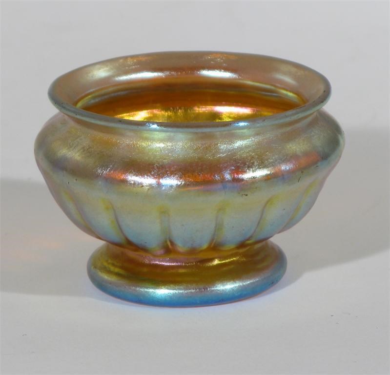 A Louis Comfort Tiffany Favrile glass pedestal coupe ribbed iridescent glass, etched L.C.T to base 6.5 cm. diam.