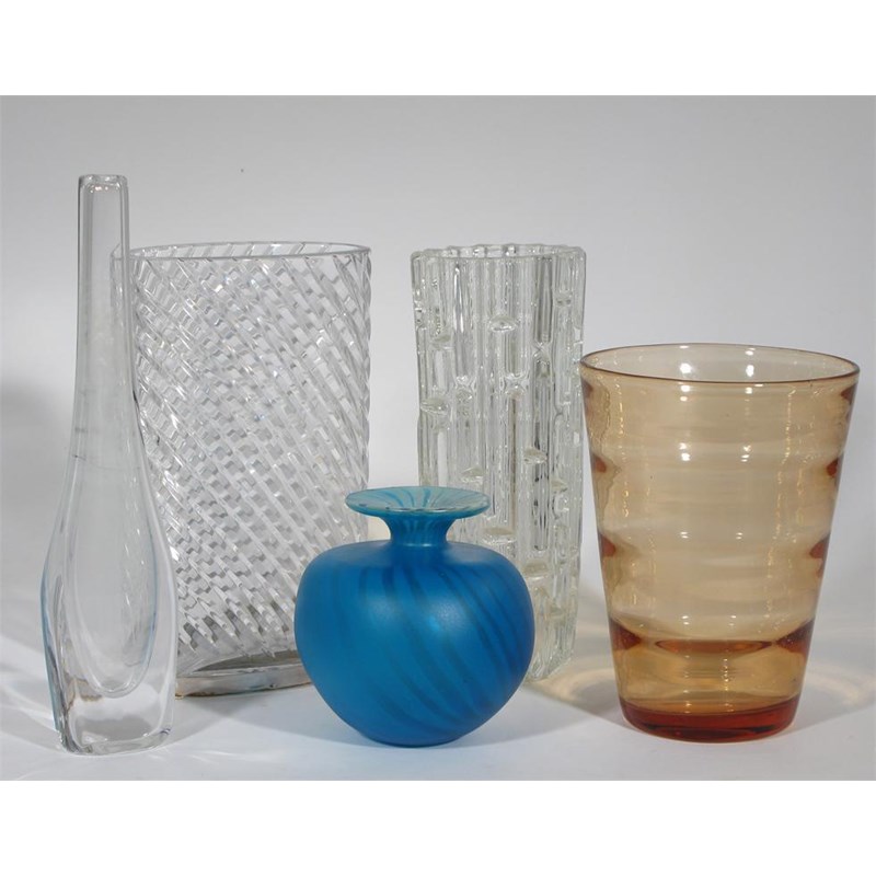 A collection of ten items of glass including a Mdina ovoid vase and an Orrefors solifleur vase...