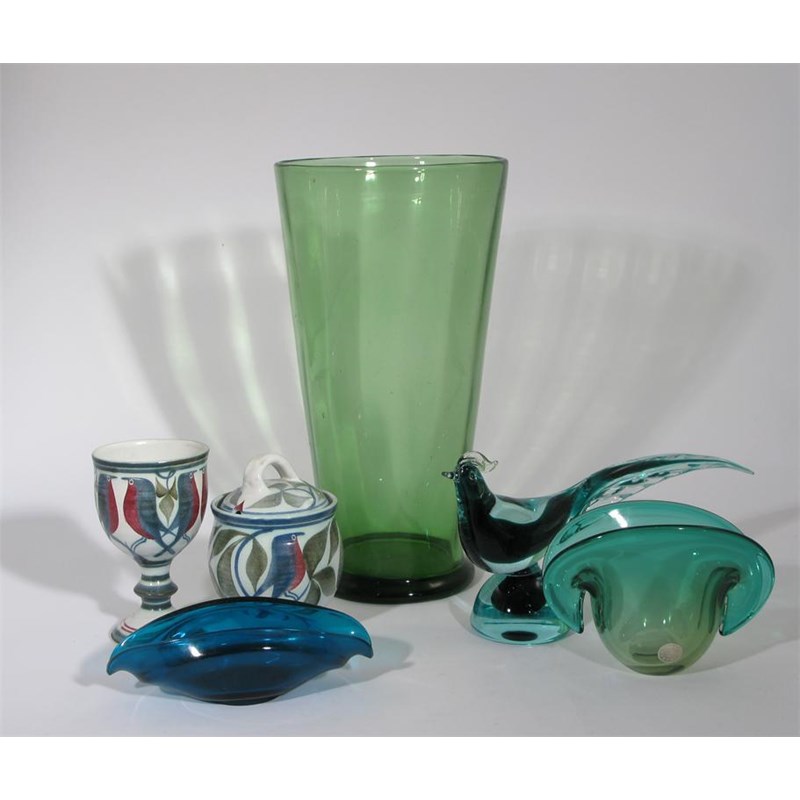 An Aldermaston Pottery beaker and preserve pot and cover painted with a robin design, and seven pieces of glass including Whitefriars and Murano painted marks to Aldermaston 14.5 cm. high