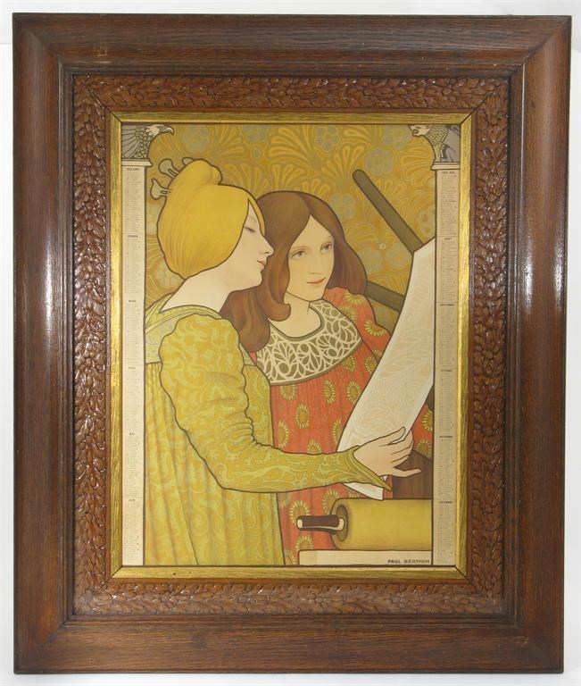 A lithograph in colours by Paul Berthon dated 1903, with carved wood frame inside oak frame signed in the print image 53.5 x 40.5 cm.