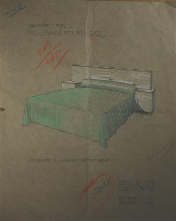 An original pencil design for a double bed for Heal & son, London, dated October 8th 1938 40 x 33cm.