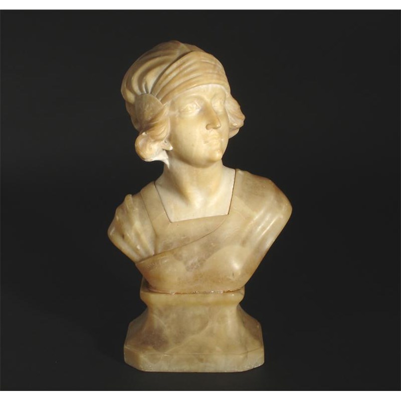 A carved alabaster bust from a model by Pineschi,  wearing cloch hat and casting an upwards gaze signed to the reverse, minor nicks 27cm. high