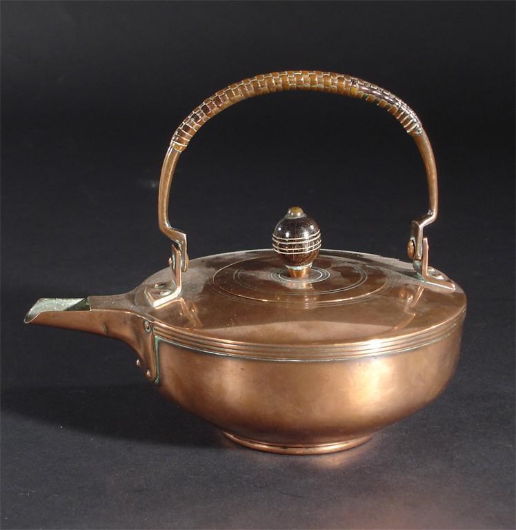 A Jan Eisenloeffel copper kettle and cover probably manufactured by F & R Fischer, cylinder form with flat top and angled spout, hinged handle with cane stamped mark to spout 15.5cm. wide Literature The Modern Art of Metalwork, Brohan Museum, page 154 catalogue number 130 for a comparable kettle