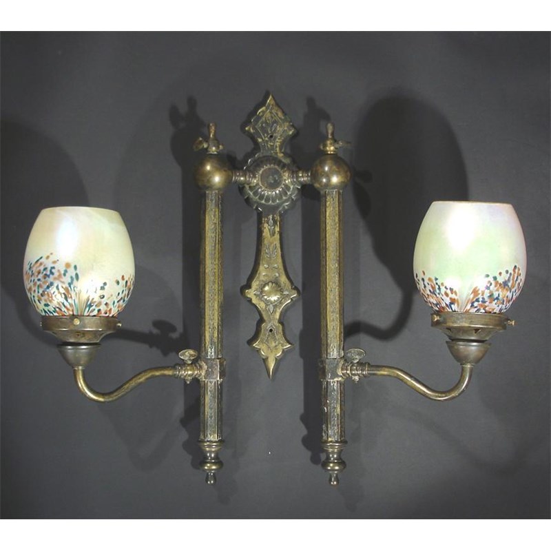 An Aesthetic Movement twin branch adjustable light with two iridescent splashed glass shades, probably Loetz unsigned 51cm. high