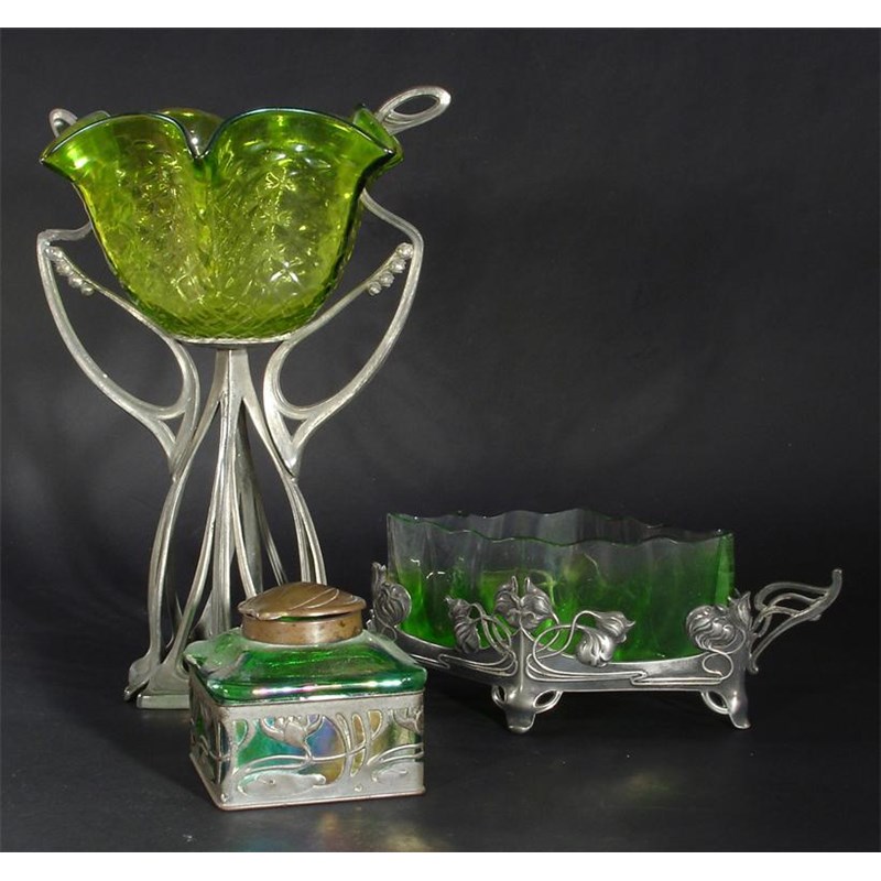 A Continental Art Nouveau pewter and glass centrepiece probably WMF an inkwell and another centrepiece various marks, damages 27cm. high