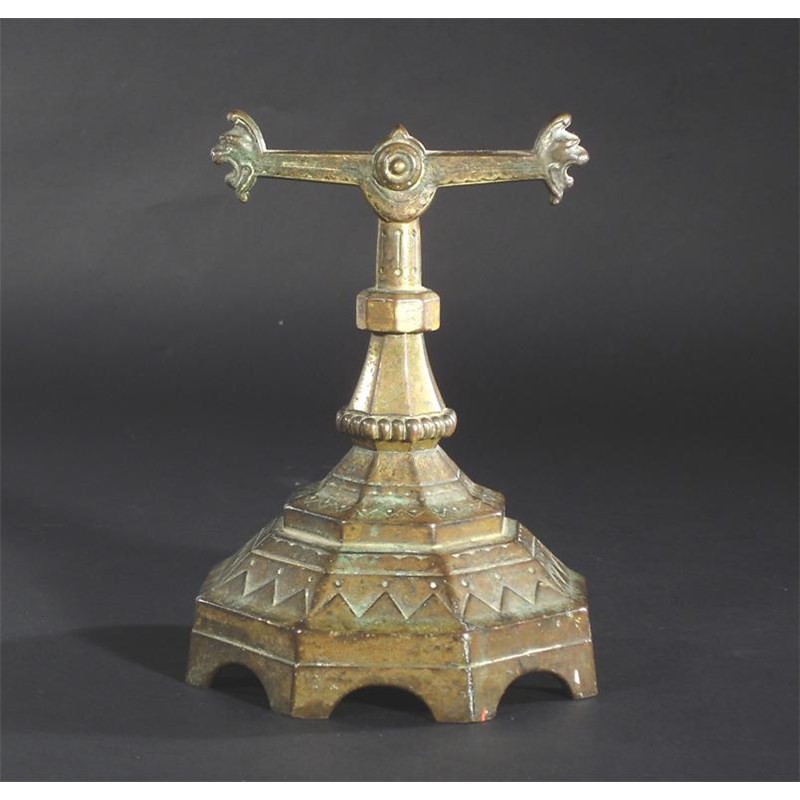 A patinated metal fire dog designed by Dr Christopher Dresser decorated with abstract panels and mask terminals unsigned 19.5cm. high