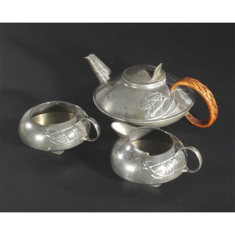 A Liberty & Co English Pewter three piece tea set designed by Archibald Knox, model no.0231, comprising teapot and hinged cover, milk and sugar basin stamped marks teapot 24cm. wide.