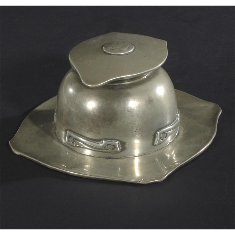 A Liberty Tudric Pewter inkwell, with hinged cover, model no.014, designed by Archibald Knox, cast in low relief with knot motif stamped marks 13cm. high
