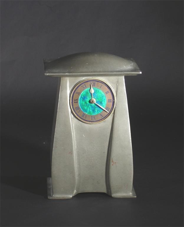 A Liberty & Co English Pewter mantel clock designed by Archibald Knox, model no.0761, architectural form with blue/green enamelled dial stamped marks 22cm. high Literature Stephen A Martin Archibald Knox ArtmediaPress page 232 for a comparable silver example illustrated.