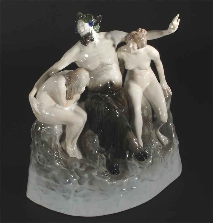 Faun with Nymphs a Rosenthal figure group painted in colours impressed and printed marks, restored fingers 25cm. high