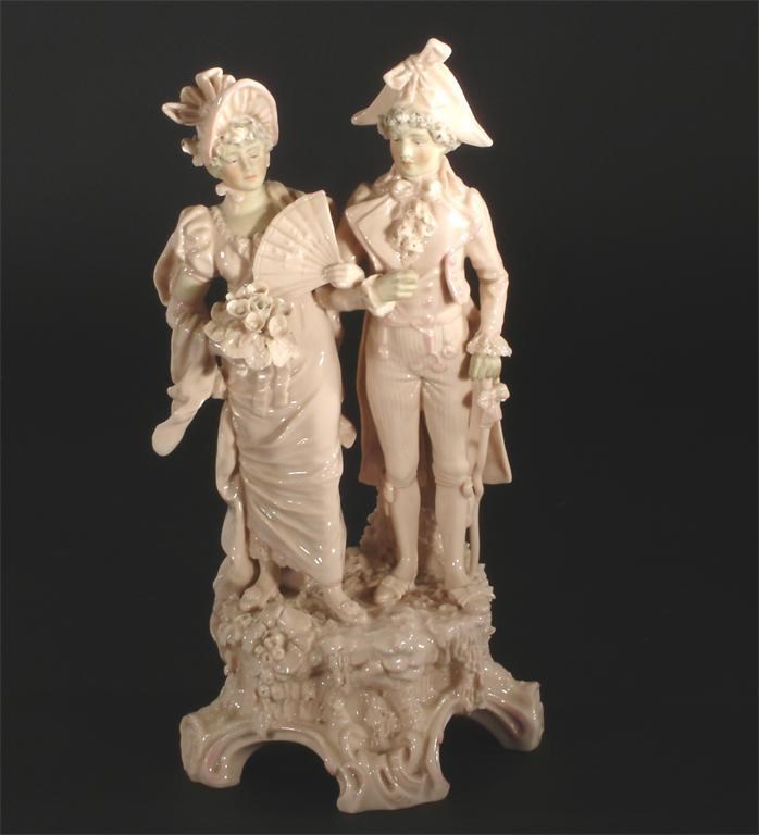 A Royal Dux figure group modelled as a promenading couple, glazed in colours impressed 54 applied pink triangle mark 25cm. high