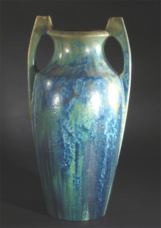 A Pierrefonds stoneware vase twin-handled form, covered in a crystaline glaze impressed mark 42cm. high