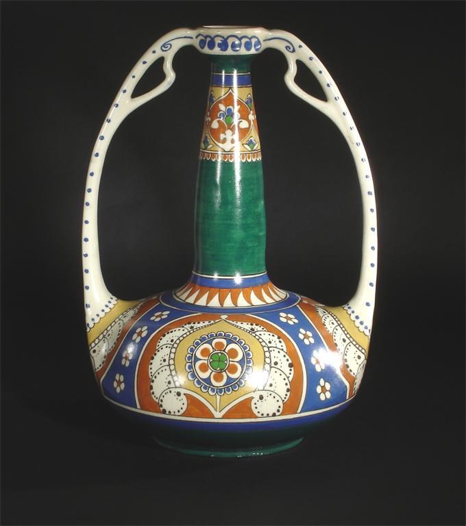 An Arnhem Pottery Lindus twin-handled vase painted in colours with panels of Art Nouveau flowers painted marks, hairline to one handle 34cm. high