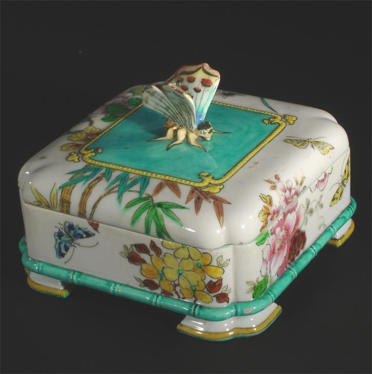 A Theodore Deck dish and cover the cover mounted with a butterfly finial, painted with butterflies amongst flowers and foliage printed mark, wing repaired 16cm. wide.