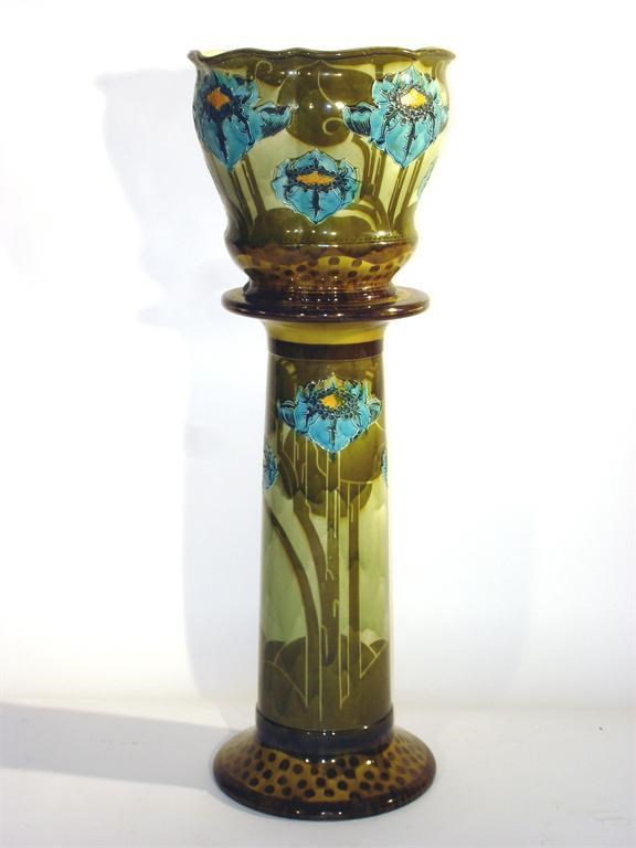 A Minton Secessionist jardiniere and stand tubeline decorated with blue opium poppies impressed...