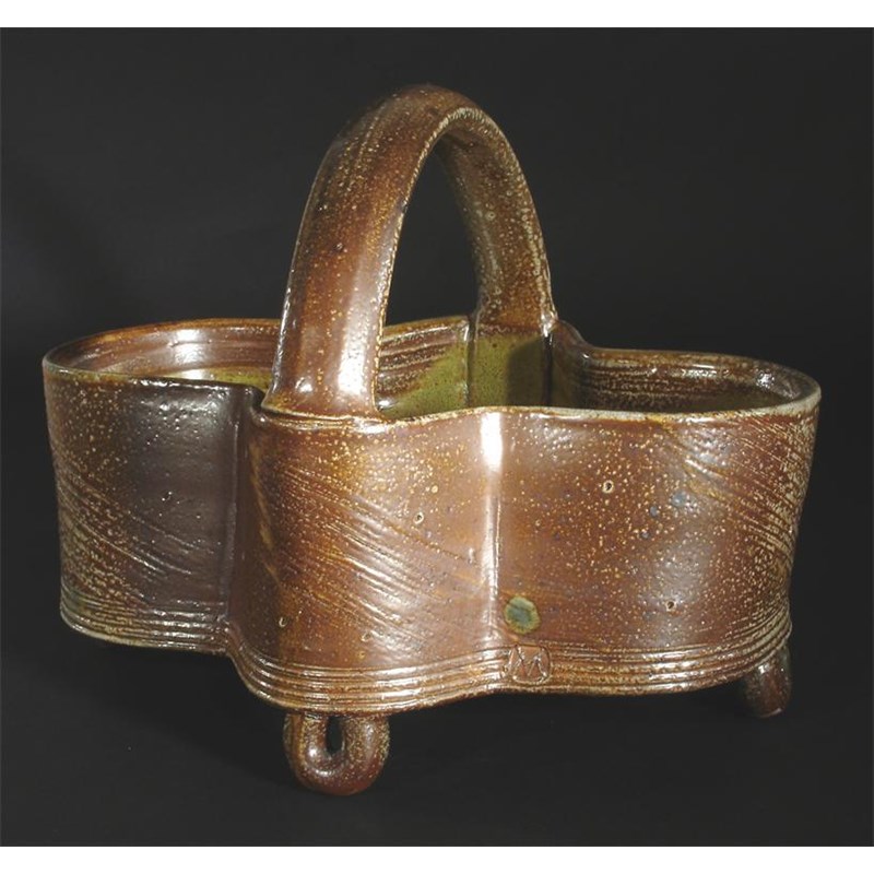 A Michael Casson stoneware basket covered in a mottled green/brown salt-glaze impressed artist seal 33.5cm. wide