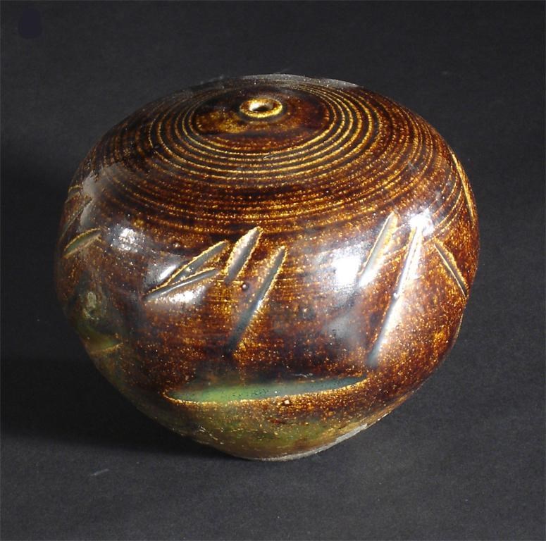 A stoneware vase probably by Tibor Reich, ovoid form with incised slash decoration, glazed brown and lustre incised Reich 12cm.  high