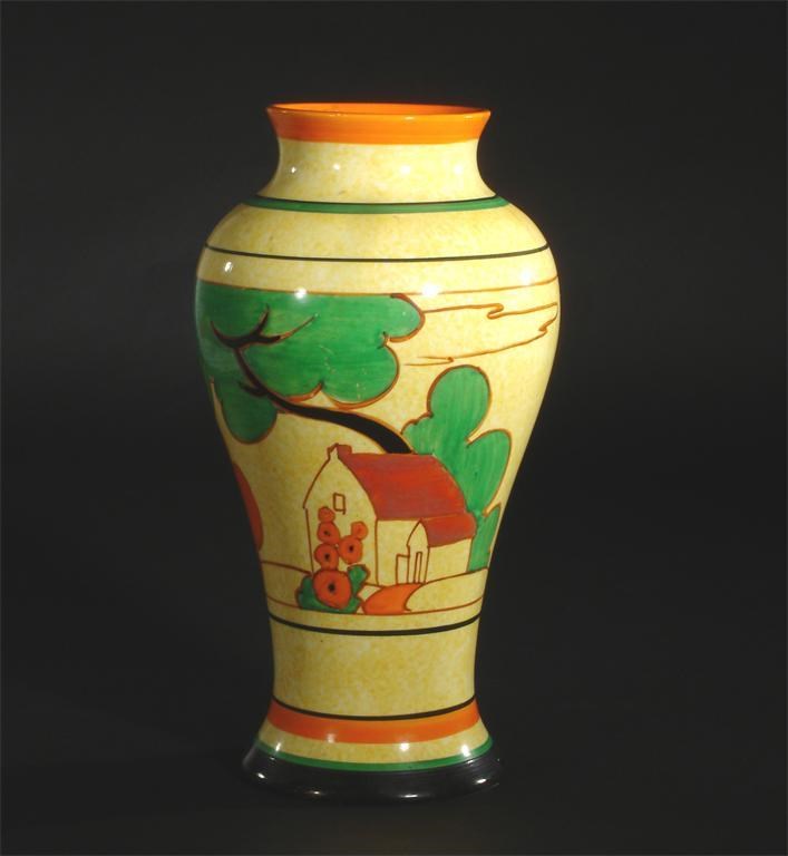 'Cafe au Lait Red Roofs' a Clarice Cliff Mei Ping vase painted in colours on a mottled yellow ground printed mark, minor paint wear 23cm. high It is believed this vase was purchased in 1935 from Bell & Edmonds department store, Westcliff for seven shillings and six pence.