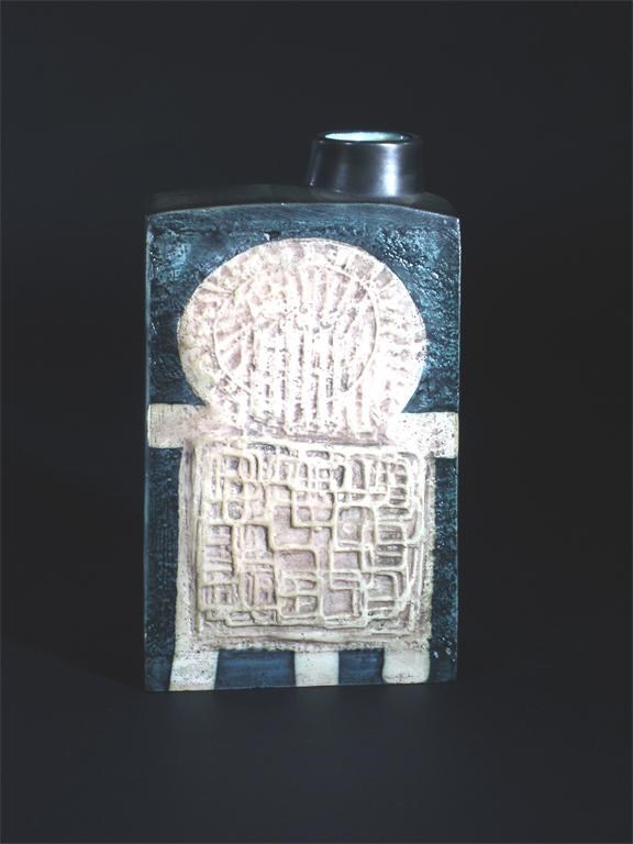 An early Troika Pottery flask by Honor Curtis, modelled in low relief with Celtic wheel and decoration, the reverse a whicker man motif, in shades of blue and buff, the shoulder and sides glazed bronze painted Troika St Ives England, HC 19.5cm. high