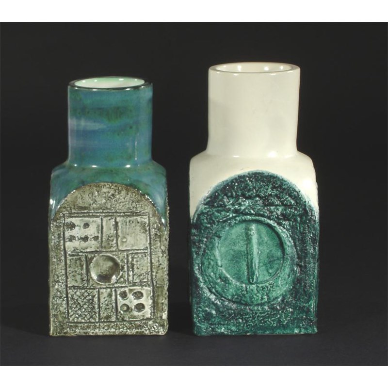 Two Troika Pottery Chimney vases modelled in low relief, painted in colours painted marks, white vase restored 16cm. high