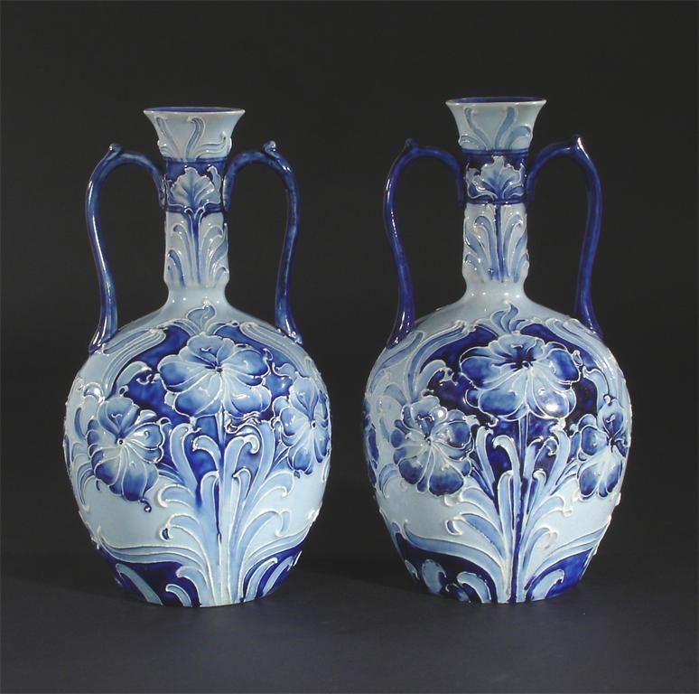 'Florian Ware' a pair of James Macintyre twin-handled vases designed by William Moorcroft, painted in shades of blue on a pale blue ground printed mark, painted green monogram, restored 22cm. high