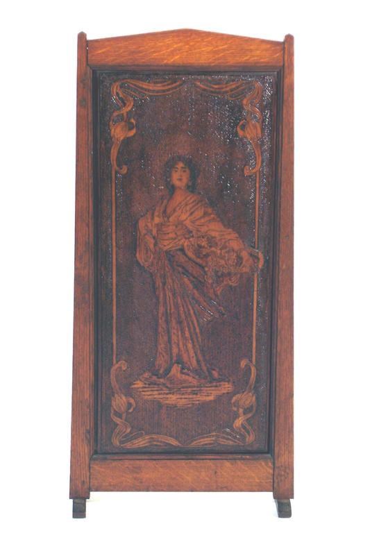 A pyrographed oak screen the central panel depicting a Spanish maiden unsigned 88cm. high
