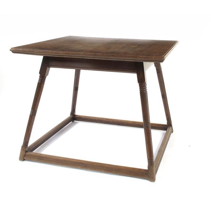 An Arts and Crafts oak table, in the manner of Charles Eastlake, square top with flaring turned legs unsigned 90 x 91cm.